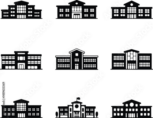 School Building Silhouette Icon Set – Vector Education Elements Black School Icons – College, Campus, and Education Building Silhouettes