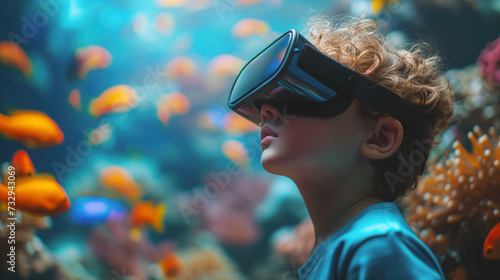 School child wearing virtual reality glasses is studying biology against the background of a flock of tropical colourful fishes in his glasses. Concept of the virtual reality in school education