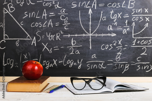 School desk in classroom, with books on background of chalk board with written formulas. Soncept Teacher's Day.