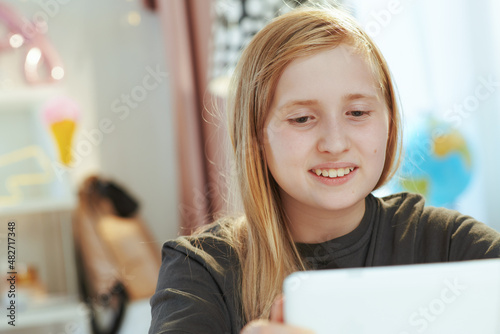 school girl having distance education at home in sunny day