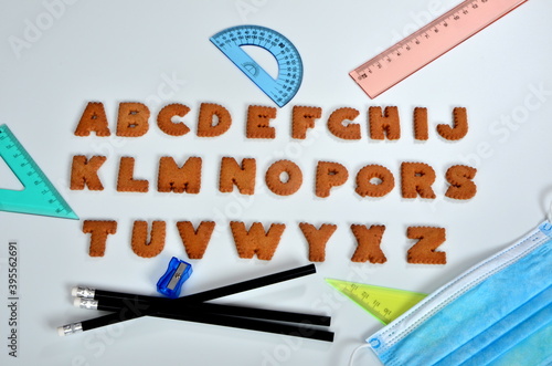 School items, face mask and gingerbread christmas alphabet on white background. gingerbread alphabet letters