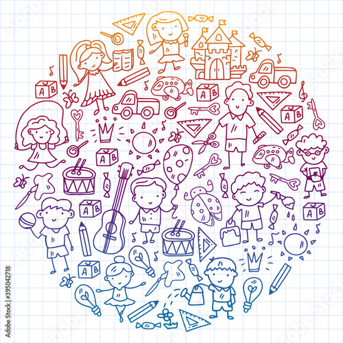 School, kindergarten with cute vector children. Dancing, singing, painting, online education. Creativity and imagination.