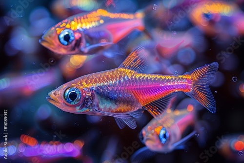 School of Neon Tetras with glowing bodies, perfect for freshwater aquarium themes.