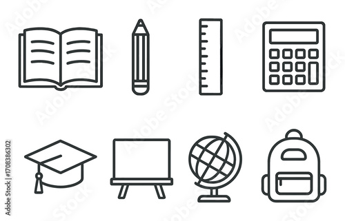 School supplies icons: book, pencil, ruler, calculator, graduation cap, easel, globe, backpack