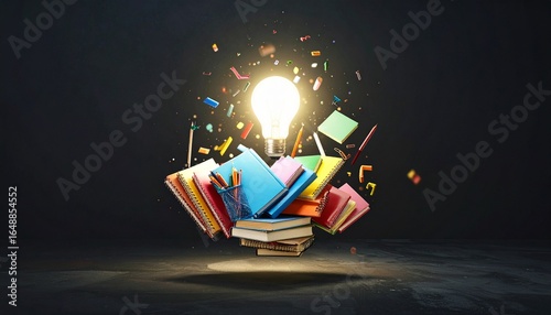 School Supplies Levitating Around a Central Glowing Light Over Dark Background