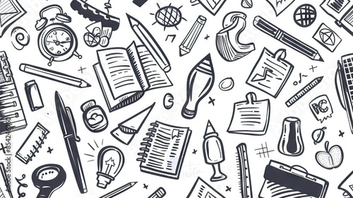School supplies seamless pattern. Education accessories pencil and pen notebook black line doodle cartoon isolated on white background creative design textile. AI generated illustration