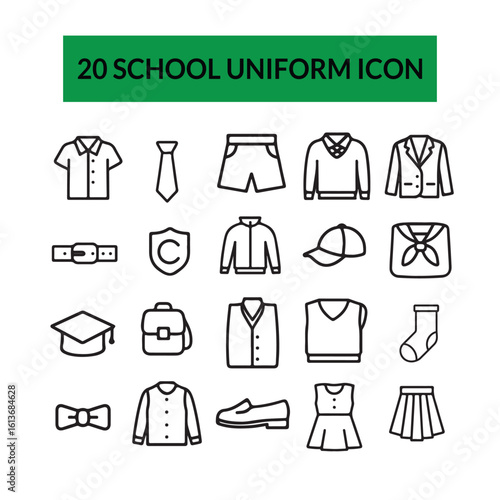 School Uniform Icon Set with Various Clothing Items and Accessories in Simple Black and White Line Art Style Design