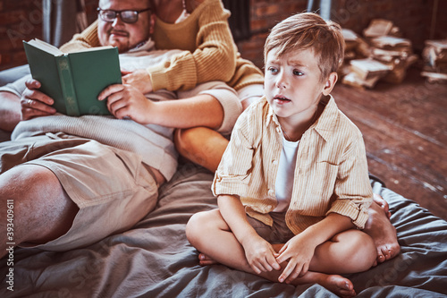 Schoolboy sitting on a bed near his father and mother reading a book lying on a bed in warm and tranquil apartment.