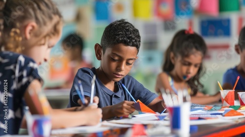 Schoolchildren creating flag art projects on Flag Day