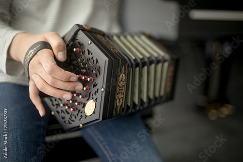 Schoolgirl playing accordion in music school
