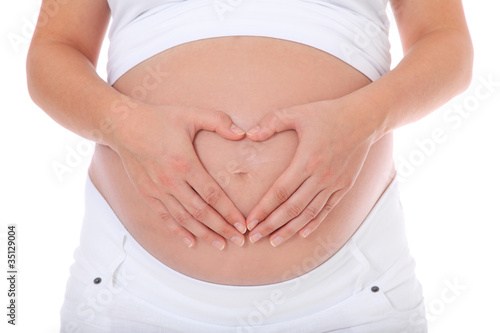 Schwangere Frau formt Herz auf ihrem Babybauch