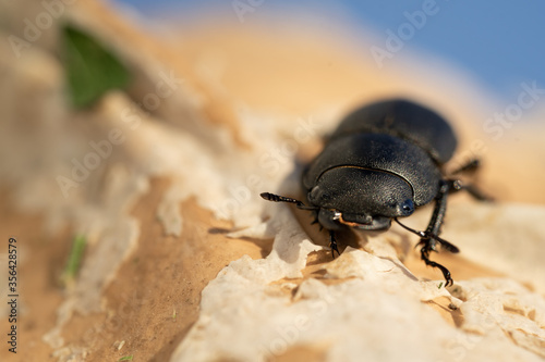 Schwarzer Käfer (Balkenschröter - Dorcus parallelipipedus) mit Tiefenunschärfe auf heller Borke