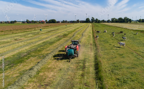 Schwarzer Treker mit einer roten Stroh Festkammerpresse bei der Strohernte auf einem gemähten Feld