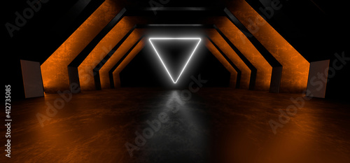 Sci Fy neon lamps in a dark tunnel. Reflections on the floor and walls. 3d rendering image.