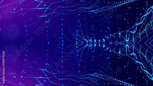 science fiction background of glowing particles with depth of field and bokeh. Particles form line and abstract surface grid. 3d rendering V27 blue