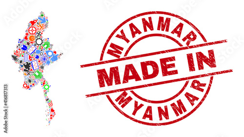 Science Myanmar map mosaic and MADE IN grunge stamp seal. Myanmar map mosaic formed with spanners, gear wheels, screwdrivers, aircrafts, vehicles, power bolts, helmets.