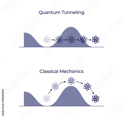Science presentation of the difference between Quantum Tunneling and Classical Mechanics , physics. Featuring electrons, particles, barrier, quant, quantum mechanics. Vector Illustration
