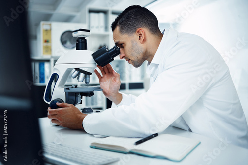 Science, scientist and man with microscope in laboratory for medical research, analysis and dna test. Healthcare, biotechnology and male chemist with equipment for study, medicine sample and virus