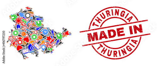 Science Thuringia Land map mosaic and MADE IN scratched seal. Thuringia Land map mosaic formed from wrenches, gear wheels, instruments, air planes, vehicles, power bolts, details.