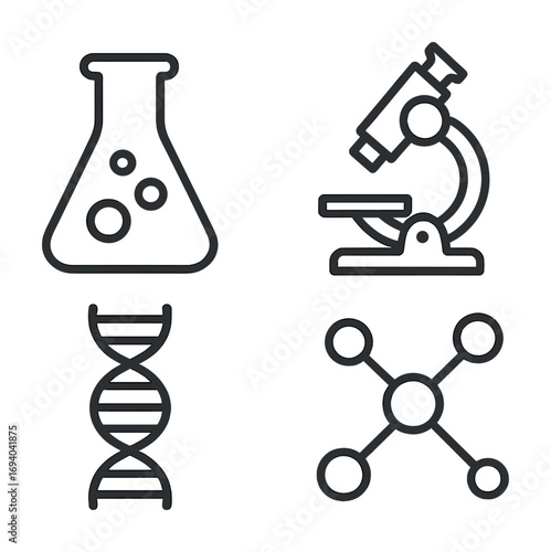 Scientific icons featuring microscope, beaker, dna helix, and molecular structure