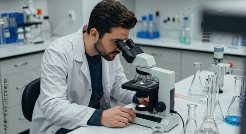 Scientific Inquiry: A focused scientist in a white lab coat meticulously examines a specimen through a microscope, the image highlighting the precision and dedication of scientific research.