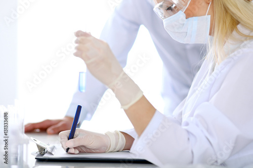 Scientific research team with clear solution in laboratory. Medicine and health care concept
