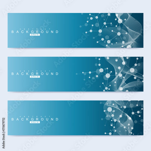 Scientific set of modern vector banners. DNA molecule structure with connected lines and dots. Science vector background. Medical, tecnology, chemistry design.