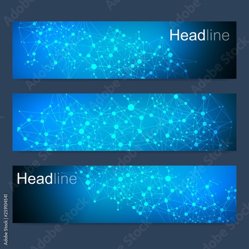 Scientific set of modern vector banners. DNA molecule structure with connected lines and dots. Scientific and technology concept. Wave flow graphic background for your design. Vector illustration.