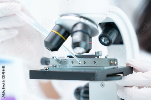 Scientist analyze biochemical samples in advanced scientific laboratory. Medical professional use microscope look microbiological developmental of viral. Biotechnology research in science lab.