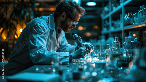 Scientist conducts research with microscope in laboratory during evening hours while focused on small glass vials and equipment