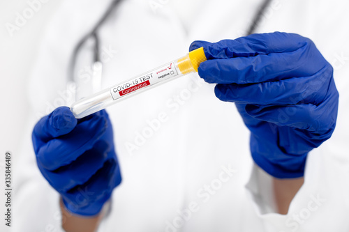 Scientist doctor holding positive test tube sample for coronavirus. Coronavirus outbreak and pandemic concept.