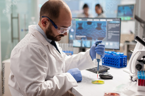 Scientist dropping blood sample with micropipette on petri dish in genetic laboratory. Team of researchers examining virus evolution using high tech for vaccine development.