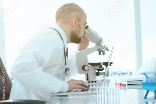 scientist examining blood samples in a lab. side view.
