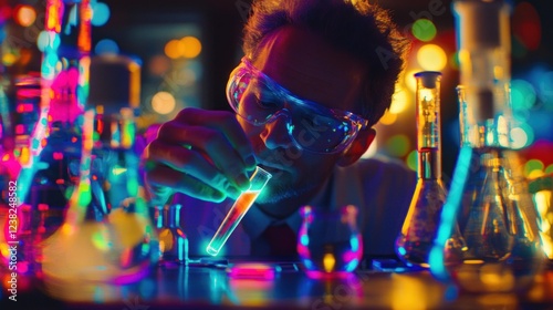 Scientist examining glowing liquid in test tube in neon-lit lab.