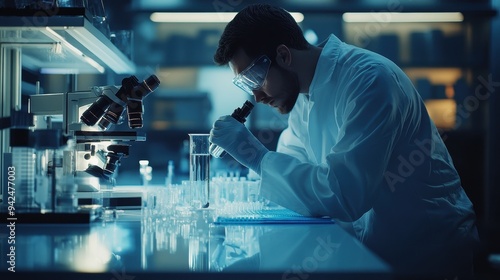 Scientist examining liquid in a beaker in a laboratory