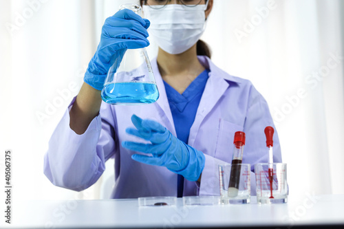 Scientist holding Coronavirus covid-19 infected blood sample tube DNA testing of the blood in the laboratory with blood sample collection tubes and syringe Coronavirus Covid-19 vaccine research.