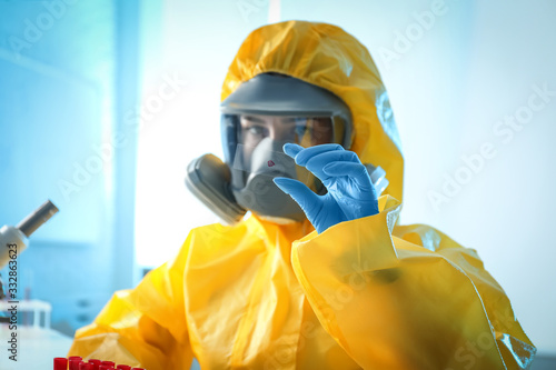 Scientist in chemical protective suit with microscope slide at laboratory. Virus research