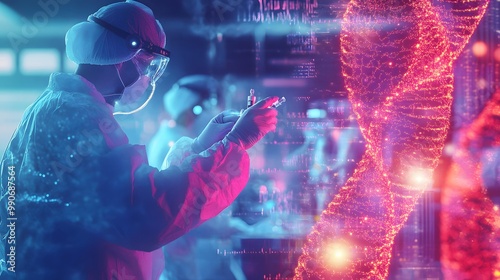 Scientist in Protective Gear Examining a Vial Against a Glowing Abstract Background