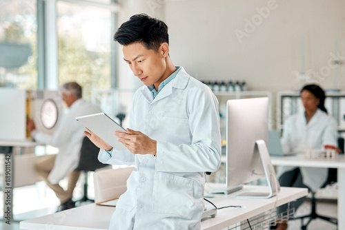 Scientist, man and online with tablet in laboratory for monitor experiment, science analysis and medical research for study. Technology, internet and digital for trial results, breakthrough and cure.