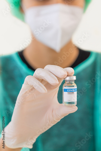 scientist or reseacher holding coronavirus covid-19 vaccine bottle