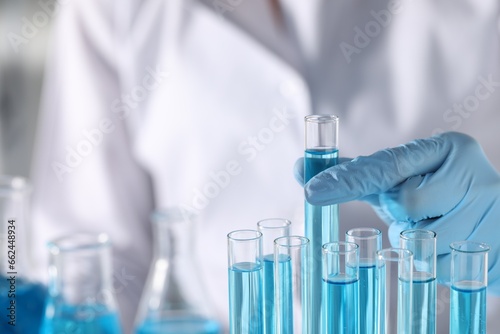 Scientist taking test tube with light blue liquid in laboratory, closeup. Space for text