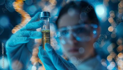 Scientist wearing gloves holding a test tube with yellow liquid doing scientific research in a laboratory