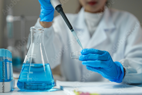 Scientist wearing lab coat and gloves using pipette to drop blue liquid in petri dish with erlenmeyer flask and test tubes with blue liquid in background, during scientific experiment in laboratory