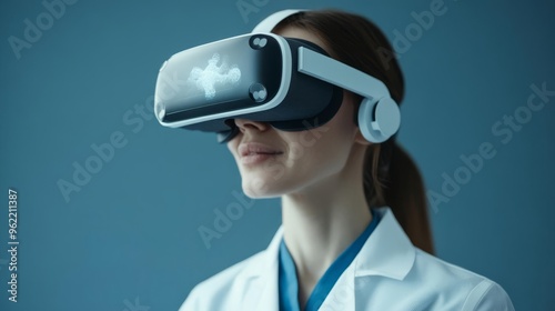 Scientist wearing virtual reality headset to simulate cell growth, biotechnology and VR, bioengineering tools