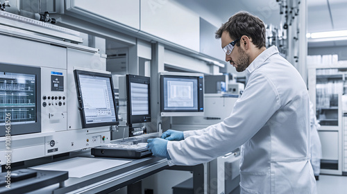 Scientist working in a laboratory with a lab coat and goggles.