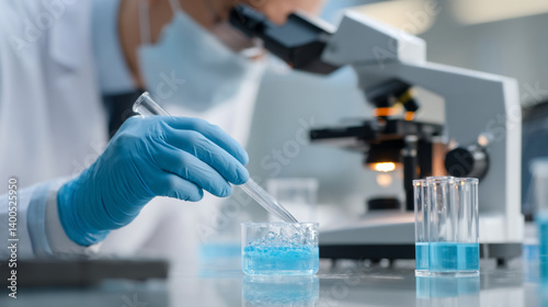 Scientist working in lab with microscope and blue liquid in beakers with blue gloves on hands