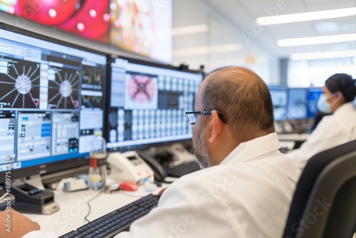 Scientists Analyzing Data on Multiple Monitors in Lab