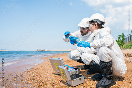 Scientists biologists and researchers in protective suits taking water samples from waste water from industrial. Experts analyze the water in a contaminated environment.