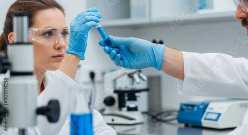 Scientists collaborating in a research laboratory. A team of researchers analyzing a blue liquid in a test tube during a chemistry or biotech experiment