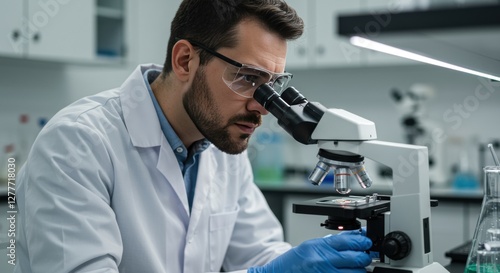 Scientist's Focused Gaze: A Microscopic Exploration in a Modern Lab